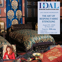 Join us for a special opportunity to learn from the incredible Helen Morris—a longtime IDAL instructor, CSA and CST Certified, and the owner of The Stencil Library in the UK. In this inspiring online class, Helen will guide you through the creative and technical aspects of stenciling on fabric, from delicate silks and velvets to linen and more. You'll learn: • The best fabric mediums to use • How to work with absorbency and texture • How light and material affect your final results • Tips for handling small to large-scale pieces • How to measure for symmetry and mitered corners Whether you're enhancing your decorative painting business or personalizing your home decor, bespoke stenciled fabrics are a timeless and versatile addition to your skill set. Don’t miss this rare opportunity to explore the modern art of custom fabric stenciling with one of the best in the field! ✨ Can’t make it live? No worries! All students will receive access to the Zoom recording.